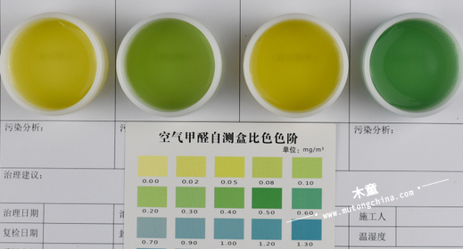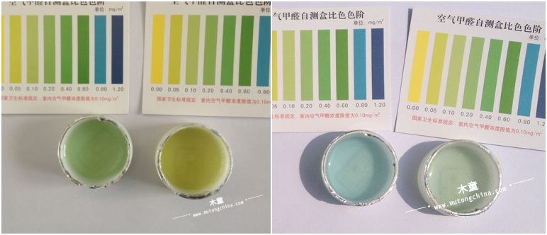 右上圖是客戶發來的檢測結果,圖中第三排兩個淺黃色的是房間內的檢測結果,其他六個都是家具內的檢測結果。家具內甲醛明顯比房間內高很多。