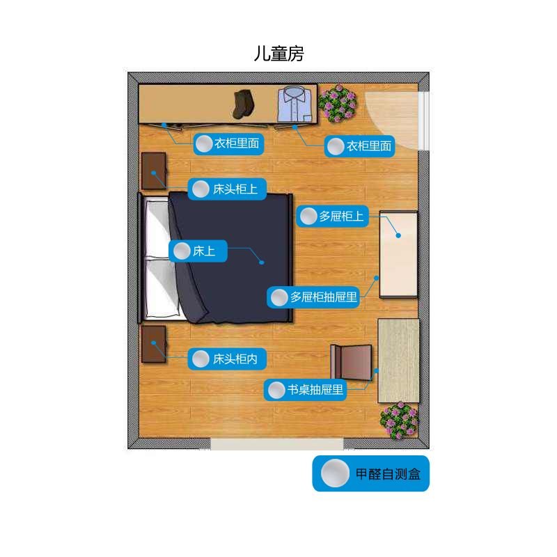 CMA標準檢測雖然能給出一個房間內甲醛濃度的精確值(如0.26mg/m³),但其檢測結果只是一個房間內甲醛濃度的平均值,不能反映床頭或床尾等不同位置的甲醛污染的實際水平,也不能反映兒童房書桌附近甲醛污染的實際水平。