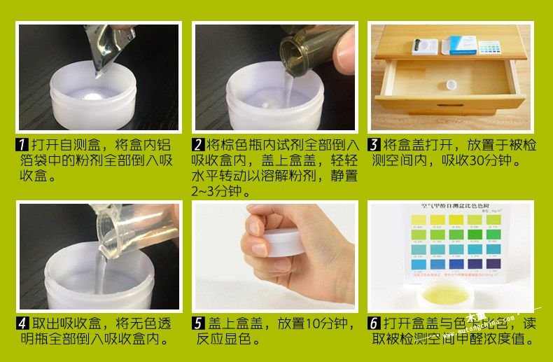 8、甲醛自測盒中的試劑,以及顯色反應后的液體,一定不要弄到家具、臺面、地面上,如不慎濺落上,請一定立即用紙巾或毛巾擦拭干凈。建議判定結果和  拍照后,及時至于垃圾箱內。