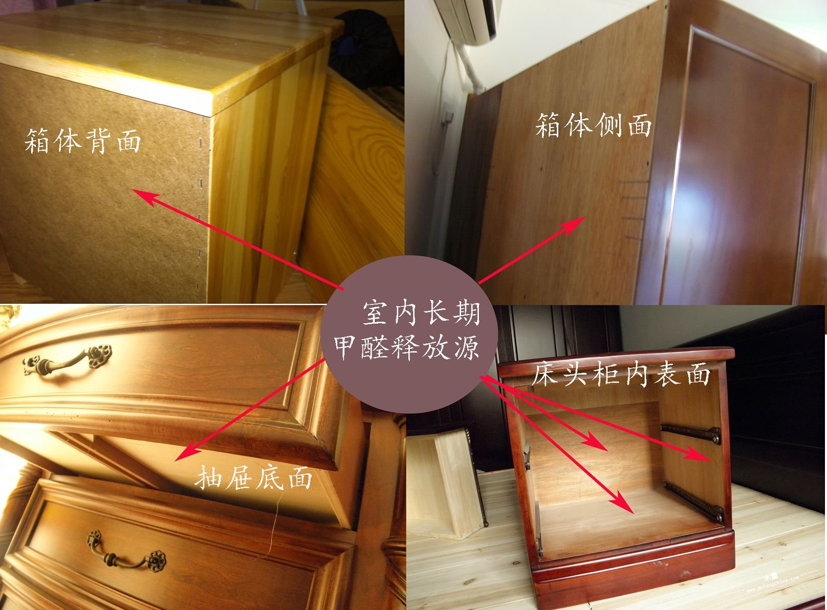 同樣的道理這些地方我們也要多留意一下:如多屜柜、床頭柜、衣柜內部、茶幾、電視柜等的抽屜,特別是這些抽屜的背面、底面、以及拔出抽屜后的箱體內側,還有床箱,衣柜內部,或各種家具的背面靠墻一側等等。因為這些是家具廠商可以降低成本的地方,不太容易看到的地方,恰恰是甲醛長期污染源的藏身之所。