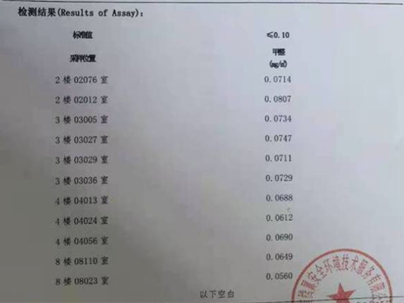 報告顯示了4個樓層11間宿舍的甲醛濃度值。樓層從高到低分別是8層、4層、3層、2層,大家可能已經(jīng)發(fā)現(xiàn),最高值在2層:0.0807,最低值在8層:0.0560。2層、3層檢測結(jié)果都高于0.07,4層、8層沒有超過0.07的。