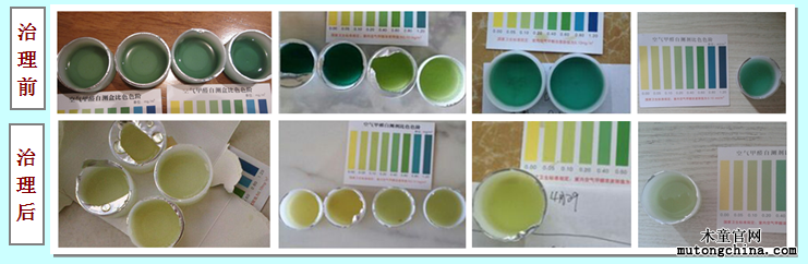 例如,治理前主臥室甲醛是0.2毫克,治理后達到0.1毫克,可是0.2毫克與0.1毫克這樣微小的差異,在檢測盒內試劑的顏色上都是黃綠色,很難區分,大多數人會感到困惑;但是污染源內的甲醛濃度一般都比較嚴重,列如很多床頭柜都能達到0.6以上,試劑顯藍色,治理后如果效果明顯,降到0.2以下,試劑顏色為黃綠色或黃色,這樣的前后對比非常明顯,一目了然。