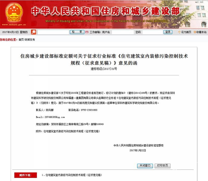 由國家住房和城鄉建設部提議,深圳建筑科學研究院、福建一建集團有限公司主編,清華大學、上海建筑科學研究院、中國建筑科學研究院、(北京中興天瑞科技有限公司旗下子公司)濟南木童環保科技有限公司、萬科企業股份有限公司、中國林科院木材工業研究所等十多家專業單位聯合編制的《住宅建筑室內裝修污染控制技術標準》行業標準,已報送住房城鄉建設部標準定額司,并得到了高度評價,在完成征求廣泛建議完善后,將按法定程序進行定稿、公布、執行。