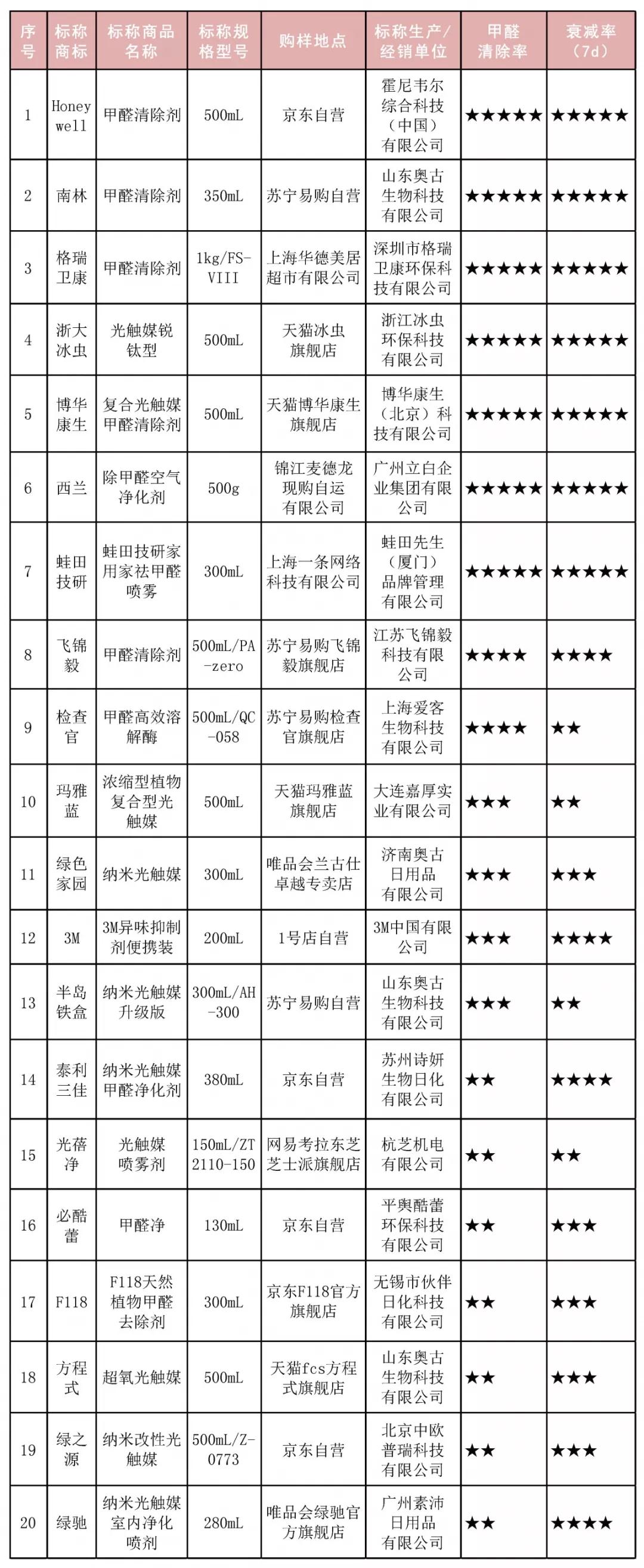 注1:甲醛清除率評分標準:5星:甲醛清除率≥75%;4星:50%≤甲醛清除率<75%;3星:25%≤甲醛清除率<50%;2星:甲醛清除率<25%。