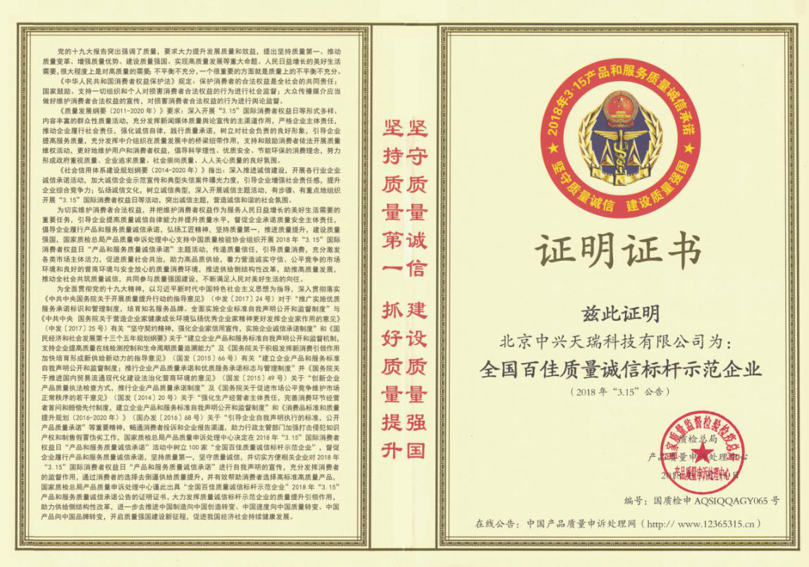 2018年榮獲國家質量監督檢驗檢疫總局產品質量申訴處理中心頒發的證書
