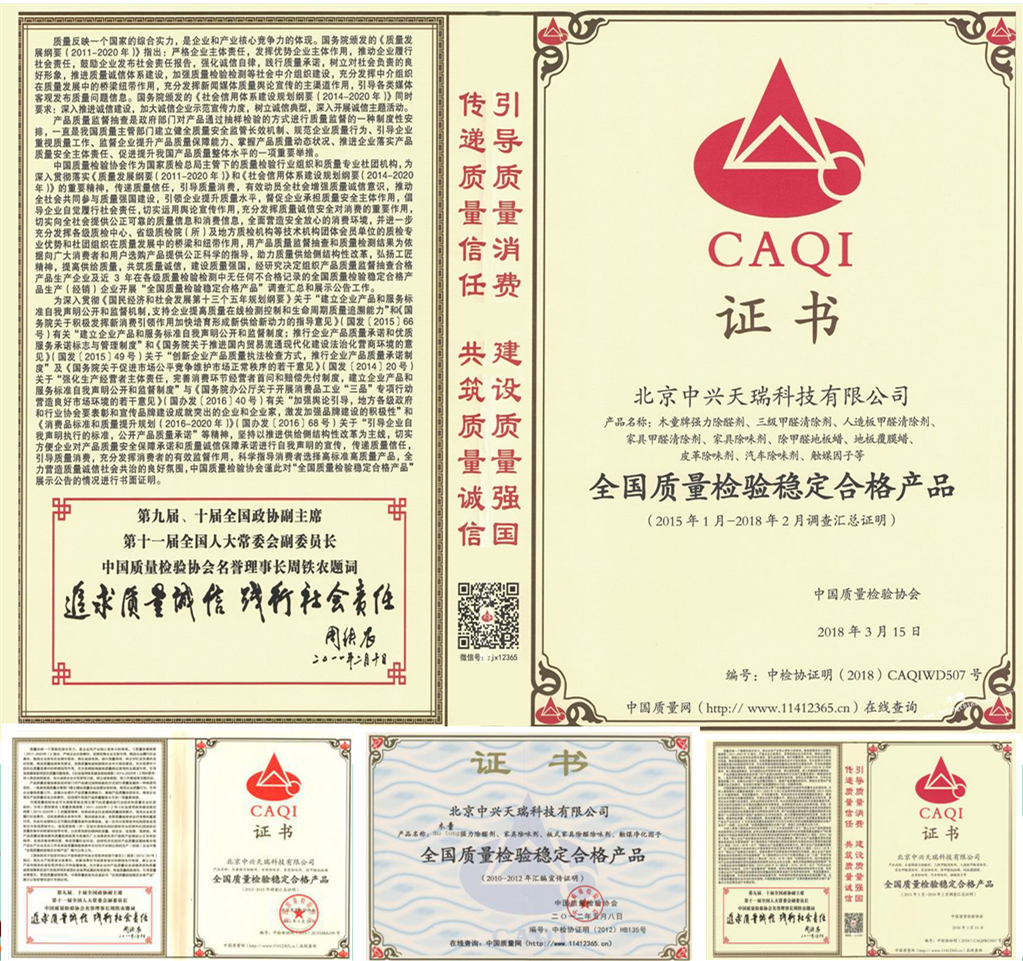 北京中興天瑞科技有限公司從成立的那天起,就堅定樹立“質量第一”的發展理念,旗下品牌木童除甲醛除異味系列產品,從未因為質量問題讓客戶擔心過。《中國消費者報》、《中國質量報》、《科技日報》、中央電視臺、北京衛視等多家進行過新聞報道,并連續多年榮獲質量檢驗穩定合格產品證書。
