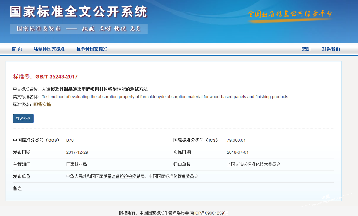 GB/T 35243--2017 《人造板及其制品游離甲醛吸附材料吸附性能的測試方法》于2018年7月1日起正式實施。