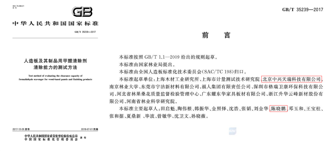 兩類甲醛清除劑產品的劃分始于2012年,由《甲醛清除劑》行業標準提出。2015年上海木材所、上海市計量測試技術研究院、北京中興天瑞科技有限公司等編寫的國家標準《人造板及其制品用甲醛清除劑清除能力的測試方法》,首次為人造板甲醛清除劑的產品性能測定確定了檢測標準,人造板甲醛清除劑正式成為由國標規范的