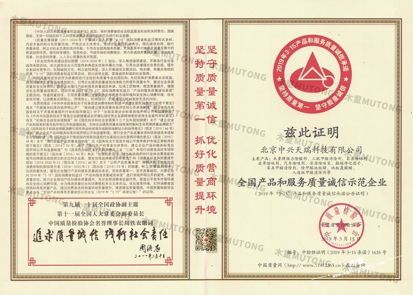木童榮獲2019年全國產品和服務質量誠信示范企業